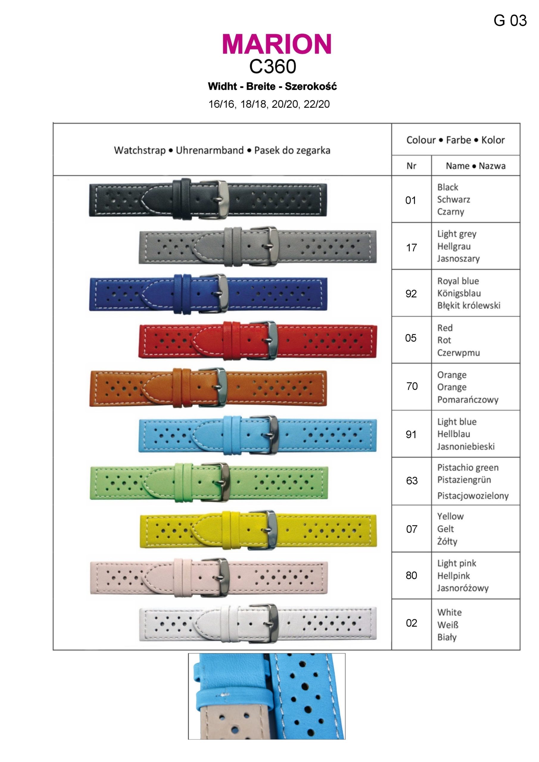 Linia MARION C360 to sportowy charakter w nowoczesnym wydaniu – paski z perforacją i kontrastowym przeszyciem łączą wygodę z odważnym stylem. Idealne dla osób prowadzących aktywny tryb życia, zapewniają przewiewność i trwałość. Dostępne w szerokiej gamie kolorów – od klasycznej czerni po intensywną żółć i subtelne pastele. Oferowane w różnych szerokościach, pasują do wielu modeli zegarków.