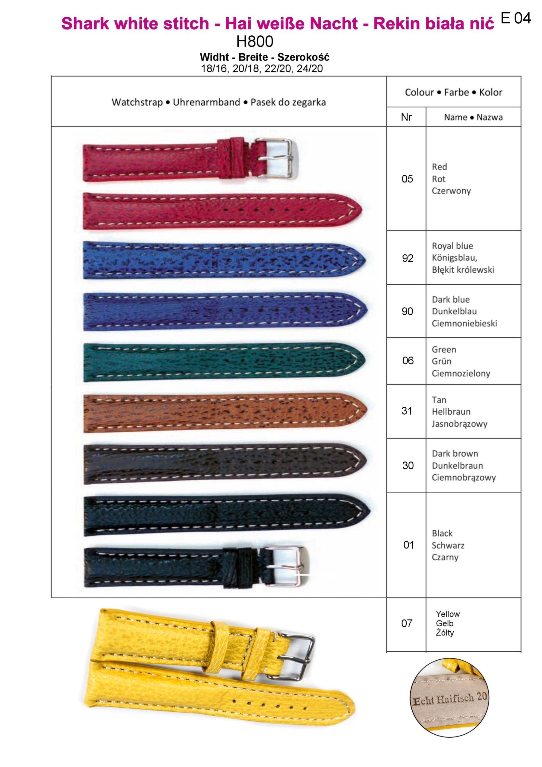 Wykonana ze skóry rekina, z wyrazistym białym przeszyciem, oferuje nie tylko wyjątkową fakturę, ale również trwałość i wygodę noszenia. Bogata kolorystyka – od królewskiego błękitu po czerwień, zieleń i żółć – pozwala dopasować pasek do każdej osobowości i stylu zegarka. To kolekcja dla odważnych, którzy lubią wyróżniać się w elegancki sposób.